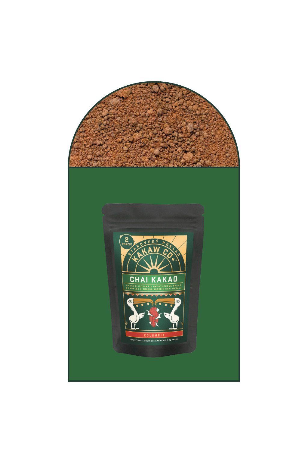 Panela, tradičný nerafinovaný šťavnatý cukrový trstinový produkt, poskytuje jemnú, zaoblenú sladkosť a dopĺňa prirodzenú horkosť kakaa. Zmes chai korenín — čierne korenie, kardamóm, muškátový oriešok, škorica a klinčeky — pridáva teplo, komplexnosť a aromatickú bohatosť, čím vytvára vyvážený a pohodlný kakaový zážitok, obzvlášť vhodný na chvíle relaxácie a ukotvenia.