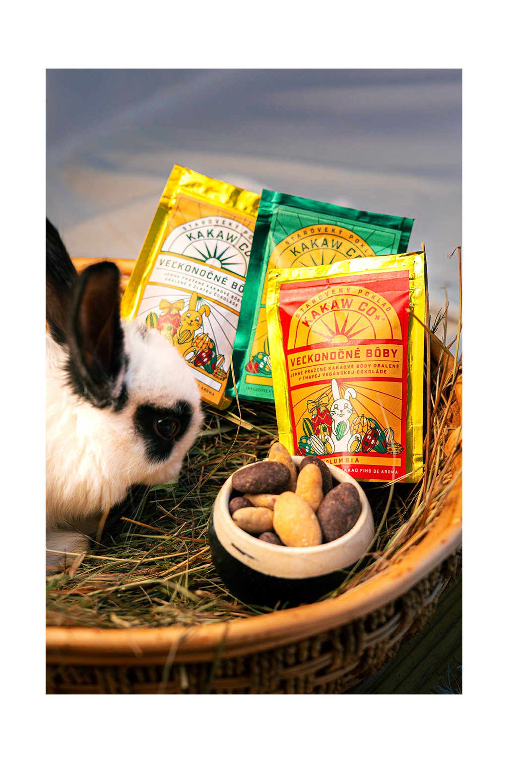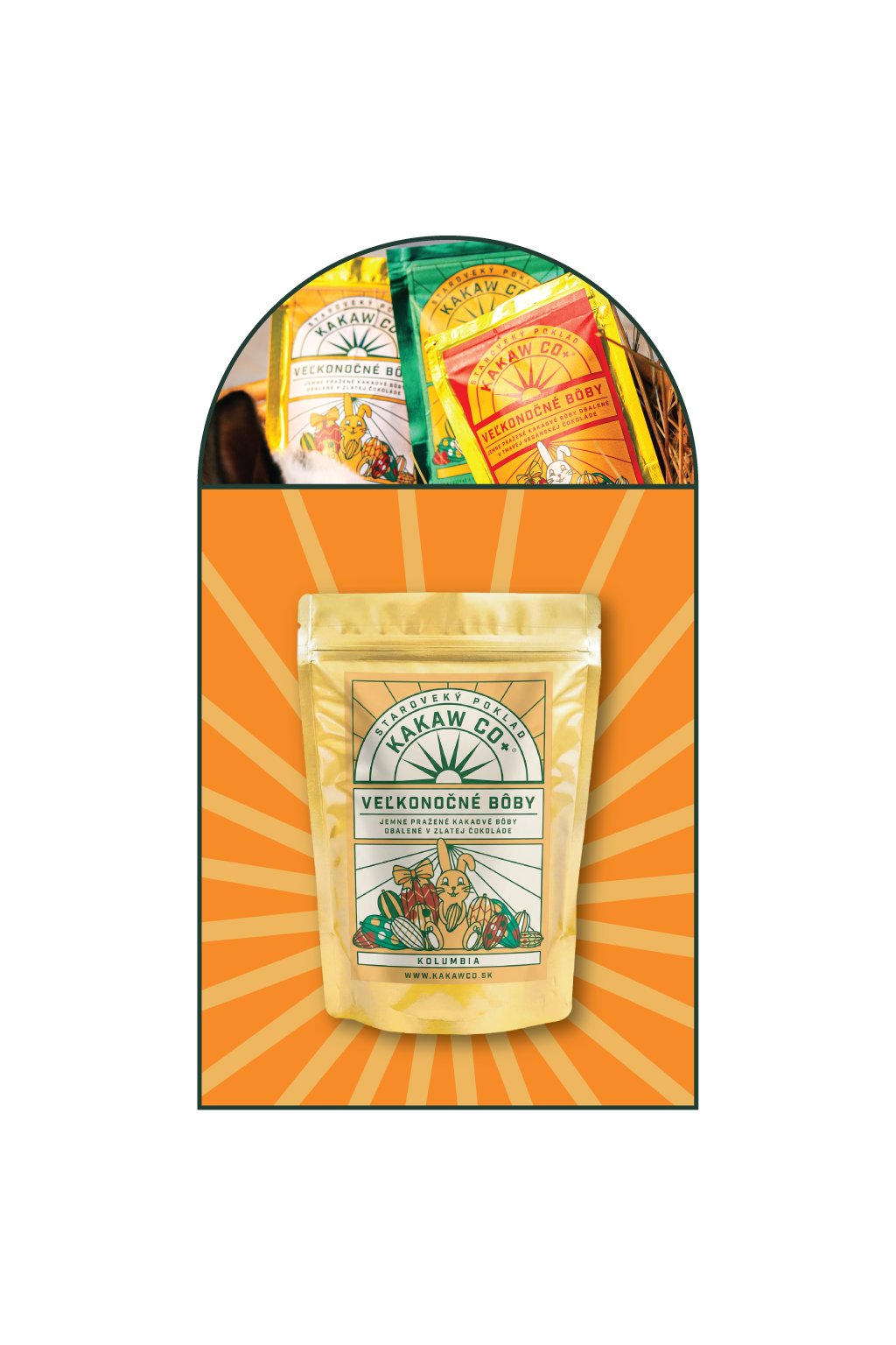 Veľkonočné bôby – Golden Cacao sú sezónnou edíciou nášho obľúbeného kakaového snacku obaleného v zlatej čokoláde. Základ tvoria jemne pražené kakaové bôby z Kolumbie, ktoré sú známe svojou bohatou chuťou a prirodzene vysokým obsahom minerálov, antioxidantov a teobromínu.